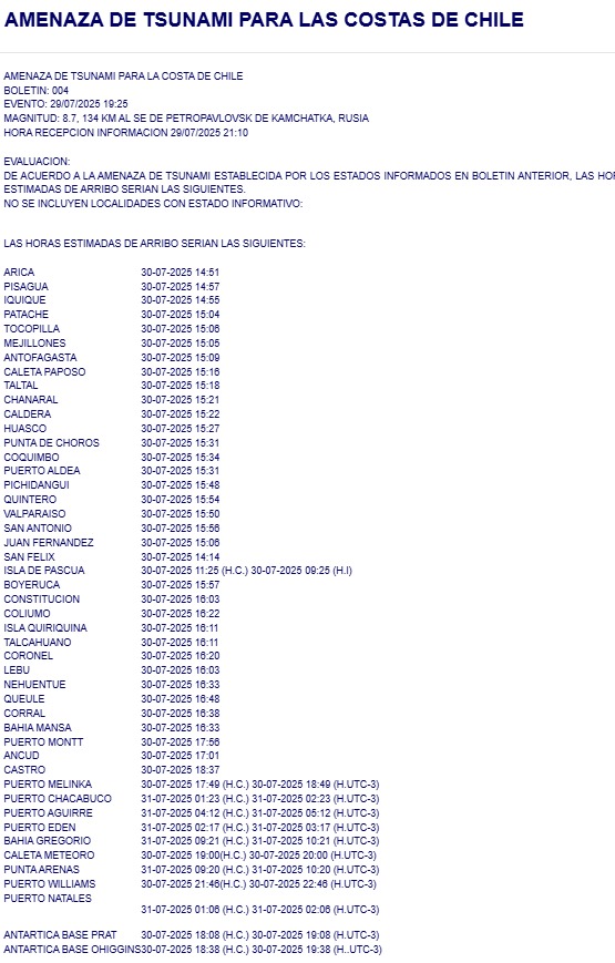 Debido a la alerta de tsunami vigente para las costas de Chile, los puertos del país podrían ver alterada su operativa, según los horarios de llegada de las olas provocadas tras el terremoto de magnitud 8.8 en la zona de la Península de Kamchatka, específicamente a 136 kilómetros de Petropávlovsk-Kamtchatski, en Rusia.